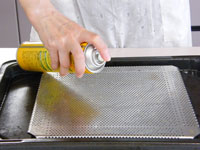 1、ドーナツ天板にシューッとオイルを吹きかけておきます。(PAMのようなスプレータイプのオイルを使うとこびりつきが少なくて後片付けが楽です)