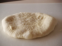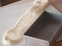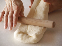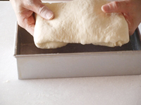 20分のベンチタイムが終了したらいよいよ成形に入ります。打ち粉を軽くふった台に生地を取り出し、麺棒を使って生地を一回り大きく伸ばします。麺棒で生地を一回り大きく伸ばします。