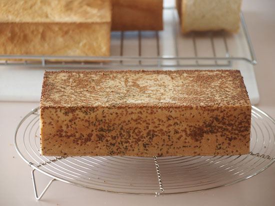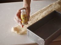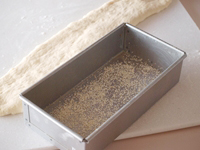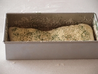ショートニングを塗った食パン型に粒状のガーリックパウダーとパセリをふりかけます。