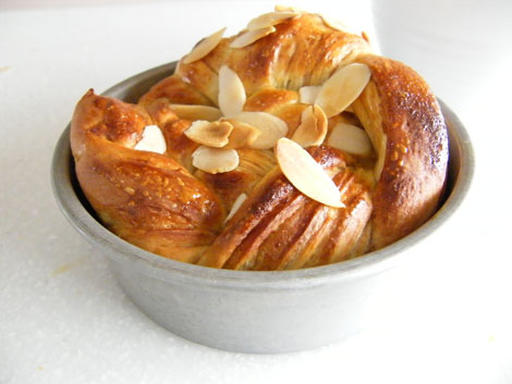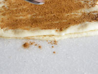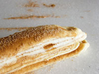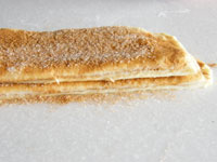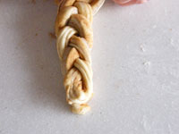 シナモンシュガーを段々に重ねながら細長くし、スケッパーで三等分にカットします。このとき一番端っこまでカットしないこと!そして三つ編みに編んで型に入れます。