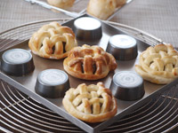 7.次に「編みカゴパン」の成形に入ります。打ち粉をふった台に生地を取り出します。麺棒で薄くのばします。できるだけ四角にのばしましょう。ピザカッターで端っこから5〜6ミリ間隔で細い紐状にカットします。紐状の生地を台の上で交互に重ねる感じで編んでから、型裏側の出っ張ったところにのせると良いです。最後に編みカゴの縁用の生地をぐるりと回して完成です。霧をふき35度で40分の第二発酵に入ります。