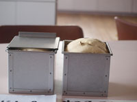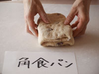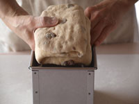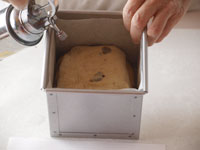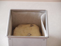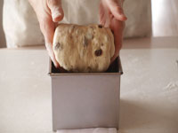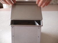 25.ショートニングを塗った12センチ食パン型に、とじ目を下にして生地を入れます。