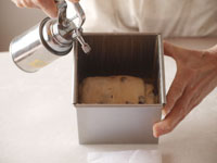 35.ショートニングを塗った12センチ食パン型に、生地を入れます。