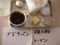 1.材料はすべて計量しておきます。バターは柔らかくしておきましょう。干しブドウは水でふやかしたものを水気をしぼってからお使いください。びしょびしょの干しブドウを生地に入れてしまうと水分量が多くなってしまい、生地がべたべたになり過ぎます。要注意!