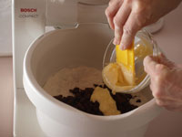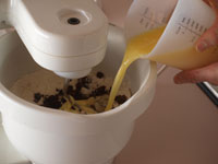4.ボッシュにパン用の羽「フック」をセットしアームを下げ、スピード「1」でスタートさせます。スタートと同時に卵液を注ぎます。計量した卵液は全量注ぎます。(湿度の高い時期には15CCほど残して加えます。パン作りの水分量は部屋の湿度によりかなり影響されます。ですので乾燥する冬と湿度の高い梅雨時では加える水分量は当然異なります。このレシピは冬に合わせた水分量です)