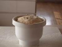 10.約1時間でこんなに膨れました。第一発酵完了のめやすは、真横からみて天辺がボッシュのボウルからちょっと飛び出しているくらいです。