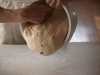 12.うっすらと打ち粉をふった台に生地を取り出します。ふっくらな生地は触るととてもいい感じです。