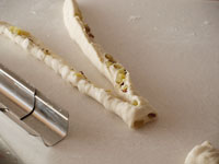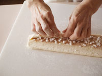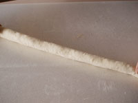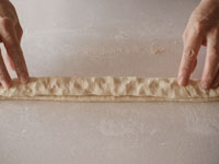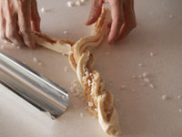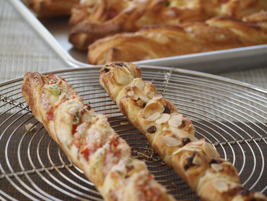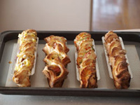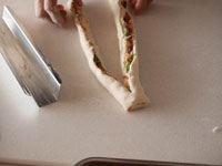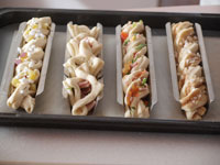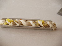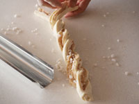 4.いよいよ成形です。一辺が26×35センチに伸ばした四角い生地を個数分にカットします。カットした長方形の生地を、さらに麺棒で26×10センチに伸ばします。今回の成形は巻き込んでから縦方向にカットしてねじるというちょっと手間をかけた成形です。26×10センチに伸ばした生地にお好みの具をのせます。海苔巻の要領で手前からきっちりと巻き閉じます。細長い状態になった棒状の生地を縦に置き、最後を少し残し手前からスケッパーで縦半分にカットします。切れ目を上に向け、2本の生地をねじり一本に仕上げます。ショートニングを塗った型に成形した生地をのせ霧を吹いて第二発酵に入ります。デニッシュ生地はバターが多めですので発酵温度はいつもより低めの28度でおよそ45分待ちましょう。この間表面を乾燥させないよう「3ピースベイカーズ」や蓋付きの高さのある容器に並べておくと良いです。(なお、成形が分かりにくい場合は細い生地を2本用意し、端っこからねじっていくだけでもOKです)