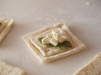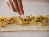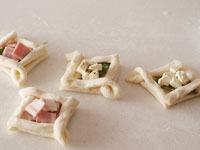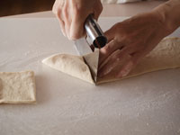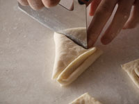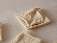 ●画像にある四角が連続の成形はこんな感じです。一辺9センチの正方形にカットした生地を使います。三角に折り、画像のようにスケッパーで切り込み入れたら生地をもとに戻します。真ん中に具を置き、周囲に水を少量つけ左右の生地を交差させる感じで重ね合わせます。一般的なデニッシュ生地の成形と同じです。成形した生地を3個を少し重ねながら型に並べます。そして霧を吹き第二発酵にはいります。
