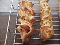 5.第二発酵が終了したら表面に溶き卵を塗り190度に予熱したオーブンで12〜15分焼きます。こんがりきつね色になったらオーブンから取り出し、型からはずし網の上であら熱を取ります。