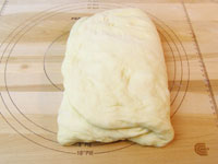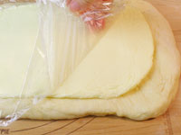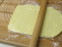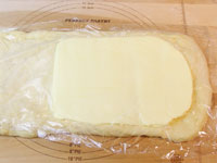 2.捏ね上がったらボッシュのボウルに生地を戻しラップをして第一発酵をします。28度で50〜60分待ちます。この間に折りたたみ用の無塩バターの準備をします。カチンカチンのバターでは上手にできませんから、室温に戻しラップにはさんで薄い四角にします。この状態で冷蔵庫で保存しておきます。実際に折りたたむときは、生地と同じ硬さになっていることが条件です。使う時間を見計らって冷蔵庫から出しておきます。