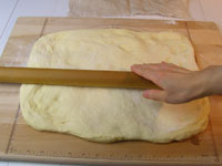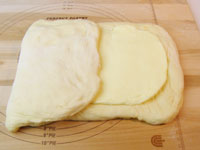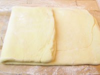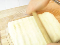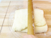 3.第一発酵が終了したら打ち粉をふった台に生地を取り出し麺棒で生地を広げます。この時生地がべたつきますので打ち粉をふりながら伸ばします。伸ばす大きさは先ほど準備したバターの1.6〜1.7倍の大きさです。伸ばした生地にバターをのせます。のせる位置は真ん中でなく、端に寄せてのせます。生地を3等分に折りたたみバターと層にします。打ち粉をふり生地を優しく伸ばしていきます。最初は面棒を押しながら伸ばすと良いです。ここで大事なのは生地からバターがはみ出さないことです。慎重にゆっくりと伸ばしていきましょう。また生地の温度が上がってしまうとバターが溶け出すことがあります。冷蔵庫で冷やしながら生地を折りたたんでいきましょう。のばしては3等分にたたむという作業を一番最初を含め4回行います。打ち粉をふることは大事なことですからしっかりと打ち粉をしてください。ですが折りたたむ際にかならず余分な打ち粉を刷毛で取り除いてからたたんでください。打ち粉が生地に練り込まれてしまうと焼き上がったときに硬くなってしまいます。これでデニッシュ生地の完成です。