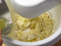 1.ボッシュのボウルに強力粉、薄力粉、塩、ドライイースト、砂糖を入れ軽く合わせます。その上に柔らかくした有塩バター25グラムをのせます。水を注ぎ入れながら生地を捏ねていきます。スピードは一番低速の「1」です。時間は8分捏ねます。手で捏ねる場合は15分間一生懸命捏ねるくらいがベストです。