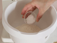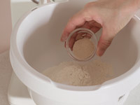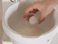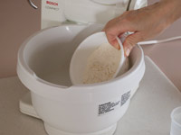 1.ボッシュのボウルに強力粉・薄力粉・ドライイースト・塩・砂糖・コショウを入れてスプーンで軽くかき混ぜます。羽はパン用のフックをセットします。