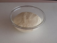 2.オリーブオイルを注ぎ入れすぐにぬるま湯も加えながら一番低速の「1」でミキシングしていきましょう。生地の仕上がりはバターロールや食パンのようにしっかりとグルテンがつながる感じではありません。薄力粉が入っているので生地が切れやすいです。全体で約7〜8分捏ねます。マシーンからはずし、表面をきれいに丸め直したらもう一度ボウルに戻します。ラップをして第一発酵に入ります。28度で約50〜60分待ちましょう。