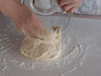 4.ベンチタイムが終了したらいよいよ成型です。打ち粉をふった台に生地を置き麺棒で伸ばします。今回は丸くて薄い生地に伸ばします。90度ずつ向きを変えながら少しずつ薄く伸ばしましょう。このときの打ち粉はいつものパンの成型に比べ、かなり多めです。麺棒を上からかけるだけではなかなか薄くのびませんから、今回はこうしましょう。うどんを伸ばすときの要領でおこないます。少し大きくなった生地にたっぷりの打ち粉をし、手前から麺棒に生地を巻き付ける感じでくるくる巻きます。このとき大事なのは、打ち粉です。強力粉の打ち粉をたっぷり目にふりましょう。こうすると生地同士が張り付きません。これすごく大事!そして方向を変えて、巻きつけて伸ばす作業を2回行います。生地が十分に大きくなったらOKです。ショートニングを塗った「ドーナツ天板」に広げます。