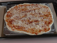 5.第二醗酵はしません。生地にフォークの先で軽くピケし(生地が膨らまないよう穴を開けること)トマトソースとアンチョビソースを混ぜたソースを塗ります。おろしたチーズものせたら190〜200度のオーブンで6分〜7分こんがり焼き上げます。