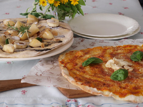 ●サクっと食感のピザは我が家でも大人気!生地を薄く伸ばすのがちょっと難しいですが、麺棒に願いを込めてうすーく伸ばしましょ。トッピングはアンチョビ入りのトマトソースをベースにして、パルミジャーノ・レッジャーノをたっぷりかけます。そしていただくときにローストしたガーリックをのせます。大人のためのワインに合うナポリ風ピザです。ドーナツ天板ならではの、下からの空気の流れを生地に伝えてカリっと焼き上げます。