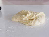 3.捏ねが終了したかどうか、生地を手にとり指先を使ってそっと伸ばしてみましょう。切れずに薄く伸びたら生地の捏ねは終了です。生地をきれいに丸めボウルに戻し、ラップをして28度のところで45〜50分の第一醗酵をさせます。