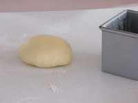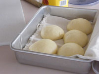 5、のし台に薄く強力粉を振り生地を取り出します。スクレイパーで5個に分割します。1個が約85〜90グラムとなります。お使いになる強力粉のメイカーやブランドによって多少の違いがあります。ごく一般的な強力粉(カメリア)に合わせました。分割したらLの字を書くようにガス抜きをし、表面をツルンときれいにしてキャンバス生地の上でベンチタイムです。乾燥させないよう上にもキャンバス生地をかぶせ大きなビニール袋に入れておけば、もう完璧です。15分のベンチタイムをとります。今回は蓋付きのベイカーにスッポリ入れてベンチタイムをしました。乾燥が気にならず、このくらいの量にはとてもやりやすかったです。