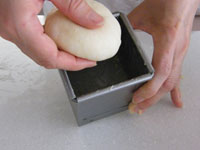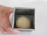 「キューブ75」に生地を入れ、その上に「ベビーキューブミニミニ50」をのせます。そして蓋をします。大事なのは「ベビーキューブミニミニ50」が端っこに片寄らないことです。そのためには安定したきれいな丸い生地に成型することです。いびつな丸だと上にのせた「ベビーキューブミニミニ50」が片寄ってしまいバランスが悪くなります。もし心配なときは、第二発酵の途中で蓋をそっと開けてみると良いです。