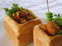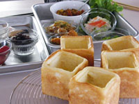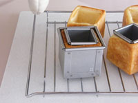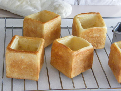 ●パンの生地量85〜90グラムあれば、こんな【ミラクル食パンボックス!】が出来ちゃいますよ!!成型もいたって簡単。ただ丸めるだけでOKです。「キューブ75」に丸めた生地を入れたらその上に「ベビーキューブミニミニ50」をのせます。そして蓋をして待つこと35分。180度のオーブンで一気に焼き上げると【不思議なボックス!】の出来上がりです。中身はたっぷりいろんな具をのせてください。「キューブ75」を焼いてからくり抜く方法もありますが、この【ミラクル食パンボックス!】の良いところは表面にすべて焼き色がついているところです。こうして焼くことで、あとから具を詰めたときパン生地に具の水分がしみ込みにくく、ぺちゃっとしないところがお奨めです。