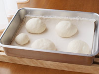 3.分割したらガス抜きをし、表面をツルンときれいにします。キャンバス生地(麻の布も毛羽が少なくお奨めです)の上でベンチタイムを取ります。表面を乾燥させないよう「3ピースベーカーズ」に並べるととっても簡単!15分のベンチタイムをとりましょう。