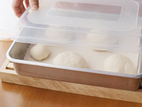 5.とじ目を下にして型にそっと入れます。霧を吹いて蓋をし、33〜35度で約35分の第二醗酵に入ります。蓋をしていますから乾燥しにくい上、移動もラクですね。ですが、蓋をしているので、第二発酵が十分に出来たかどうか確認することができません。一番初めは蓋をそーっとずらして中の生地の膨らみ具合をのぞいてみると良いです。真横からみて一番天辺が型の一番上より5ミリほど下まで発酵していたらOKです。それ以上発酵していると焼いたときに生地がはみ出すかもしれませんね。