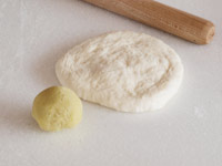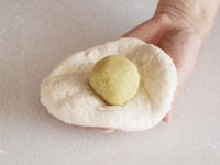 4.15分のベンチタイムが終了したら成型です。台に生地を置き麺棒で薄く伸ばします。広げた生地を手のひらに広げ、中央にスイートポテトを置きます。周囲の生地をたぐり寄せながらピチっと生地をつまむ感じでくっ付けましょう。
