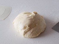3.ベンチタイムが終了したら、成形です。麺棒でひとまわり大きく伸ばし、手前、向こう側と生地を3分の1ずつ折ります。棒状になった生地を指ではさみ、麺棒をかけながら少しずつ長くしましょう。おおよそ27〜28センチくらいに伸びたら、生地を折りたたみます。このときのたたみ方はジグザグです。巻き込まずに折りたたむ方が、角がしっかりと出るパンに焼き上がります。成形の仕方で焼き上がりの形が違ってきますので、ここはポイントです。