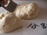 1〜3.第一発酵が終了したら打ち粉を軽くふった台に取り出します。この瞬間がガス抜きでもあります。生地を半分に分割します。
