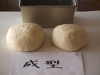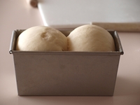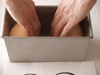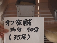 1〜2.表面に霧を吹き、発酵器に入れて第二発酵をします。条件は35度で35〜40分です。なお、この段階で、生地温度が低い場合は、60分ほど発酵時間がかかることもあります。第二発酵のめやすは、真横からみて一番膨らんだ部分が型より 1.5センチほど膨らんでいることです。これで第二発酵は完璧です。