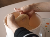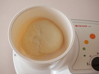 3.捏ねが始まったら蓋をします。慣れないうちは、途中で様子を見ると良いです。20分捏ねたら生地の状態を確認しましょう。指で生地を伸ばし切れることなく薄く伸びたら生地の捏ね上げは完了です。まだのようでしたら、あと5分ほど捏ねます。