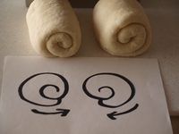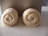 13〜15.同じ要領で二つの生地を渦巻きに仕上げます。ショートニング(バターでも可)を塗った型に生地を置きます。渦巻きの方向を確認し、さらに綴じ目が下になるよう生地を型にいれます。生地を置く場所は外側に寄せて置きます。(真ん中が空くように)