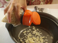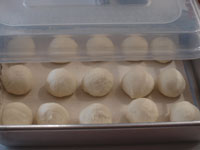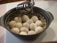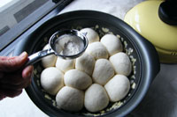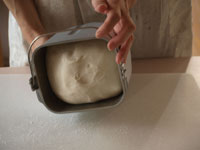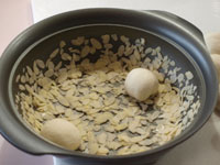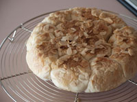 4.第二発酵が終了したら表面に茶こしで強力粉をふります。そして蓋をして弱火で焼き上げていきます。焼き時間は片面15分。ひっくり返して6分焼きます。時間まで焼いたら念のため中まで火が通っているか竹串をさして確認しましょう。中まで焼けていたらアーモンドスライスがついている方を上にして網の上で冷まします。 MEMO 今回は米の粉が15%入っているので、強力粉100%の生地に比べ膨らみはやや悪いです。ですが強力粉100%のパンに比べると米粉のお陰でもっちり食感が味わえます。お食事向きのテーブルパンとしていかがでしょうか。今回はなんといっても万能鍋「カラド」の抜群の高性能が実感できた気がいたします。鍋底が厚い(4.3ミリ)お鍋でないとパン生地の直焼きはなかなかできません。ガス台の火力はできる限り弱火で焼いてください。 |