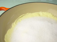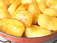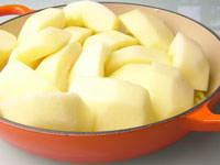 MEMO リンゴを煮たキャセロールがそのままオーブンに入ってしまうのは助かりますね。(もしシュクレーヌが手に入らない場合はグラニュー糖で代用してください。)ぐつぐつ煮込んでいる間もさすがにクルゼです。焦げてきそうでなかなか焦げてこないのはちょっと安心。ビュッフェで今回のようなお砂糖たっぷりのリンゴを煮てもゆっくりゆっくり煮えてくるので不思議とリンゴも煮崩れません。4分の1にカットしたままの形が残っているのがうれしいです。
