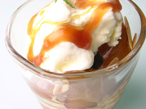 ●リンゴをとろとろに煮たところをさらにシュクレーヌを振ってオーブンの高温の上火だけをきかせてこんがり焼いてみました。本来ならバーナー(こてのようなもの)で焼くところですが、なかなかご家庭では、お菓子用のバーナーは大袈裟ですので純度の高いグラニュー糖をさらに極微粒に仕上げたシュクレーヌを使ってキャラメリーゼ風にいたしました。とろけそうなリンゴのトロトロを表面の部分だけ、思いっきりカラメルに仕上げました。今回の良いところはぐつぐつリンゴを煮込んでそのままオーブンに入れて表面をカリカリにしてしまうところです。熱々のリンゴにひんやりバニラアイスを添えて上からシナモンなど振ってみてはいかがでしょうか?かなりはまってしまいそうなデザートです。