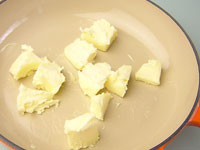 1.リンゴは皮をむいて4分の1にカットし、食塩水につけておきます。底の部分にバターを塗りグラニュー糖を全体に広げます。