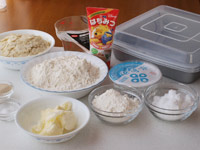 1.ボウルにバターと水以外の材料を入れて全体を混ぜます。このとき砂糖や塩の固い粒があったら、指先でつぶしておきます。粉類をよく混ぜたら、その上に柔らかくしたバターをのせます。分量の水を加えながら捏ねていきます。