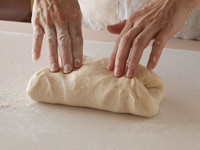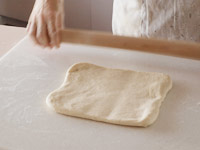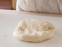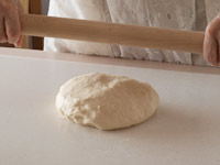 5.15分ねかせた生地を台に取り出します。四角い形になるよう麺棒をかけ横長にたたみます。そしてキャンバス生地の上で10分のベンチタイムをとります。