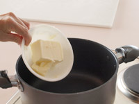 4.この間にフィリングの用意をします。お鍋にバター、グラニュー糖、蜂蜜、水あめを入れ中火にかけます。全体がふつふつして、泡がたってきたような状態になったら、火を止め、空焼きしたアーモンドスライスを一度に入れます。全体をよく絡め、そのまま置いておきます。