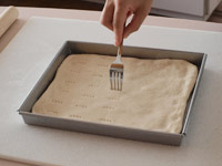 6..再度、台に取り出し、型にぴったりサイズになるよう生地を伸ばします。フォークの先で表面をピケします。(膨らまないよう、フォークの先っぽで穴をあけること)先ほど準備しておいた「4」のフィリング」を生地の上に広げます。そしてそのまま約20分、発酵させます。
