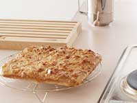 ●側面が垂直に立ち上がったロールケーキ型で「ビーネンステーヒ」を焼きました。「26センチロールケーキ型」で2枚分です。粉量は400グラム。一枚ではあっという間になくなってしまうので、ぜひ2枚分捏ねることをお奨めします。カリカリトッピングのアーモンドスライスがとにかくやみつきになる「ビーネンステーヒ」です。一発酵時間も少なめで、短時間でできるところがいいですね。ぜひお試しくださいませ。