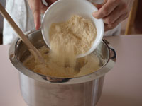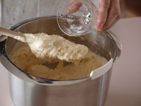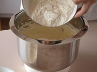4.最後に水をスパチュラで受けながら回し入れ、馴染ませます。型に流し入れて中央をややへこませます。これで準備完了です。