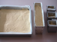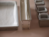 ※型に敷き紙を敷いておきます。(今回は3種類の型を使用しましたが、卵3個で作るなら「スリムパウンド型1個」+「ミニミニキューブ3個」の型に敷き紙を敷きます)