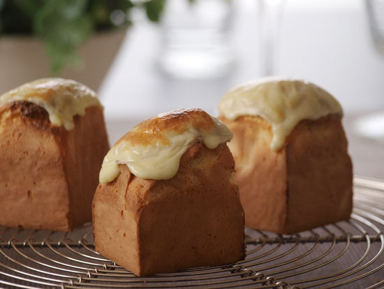 7.いよいよ仕上げの「チーズon」です。ミニミニキューブのスポンジには天辺にとろけるチーズをのせます。スリムパウンドのスポンジは薄くスライスしてそのままどうぞ!ロールケーキ型で焼いたスポンジ生地は細くカットしスティック状にし、片側にとろけるチーズをのせます。