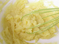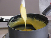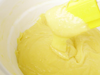 3.火からおろし卵を加えます。溶きほぐした卵を3〜4回に分けて加え、その都度しっかりかき混ぜます。最後に加える卵の+α分ですが、シュー生地の硬さを見ながら加えます。卵を多く加えた方が膨らむわけですが、入れすぎて、ゆるくなりすぎても困りますから、様子を見ながら加えましょう。これでシュー皮は完成です。