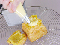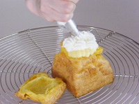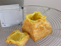 6.きつね色に焼きあがったシュー皮を網の上に取り出し、熱いうちに包丁で切れ目を入れます。