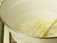 2.ふるった薄力粉を一気に加え、木ベらでぐいぐいかき混ぜます。ここで温度が下がらないよう、弱火にかけ小麦粉に火を通しつつ、さらにしっかりとかき混ぜます。小麦粉に粘りを持たせることでシュー皮が膨らみますから、しっかりと混ぜることが大事です。(およそかき混ぜること1分30秒)
