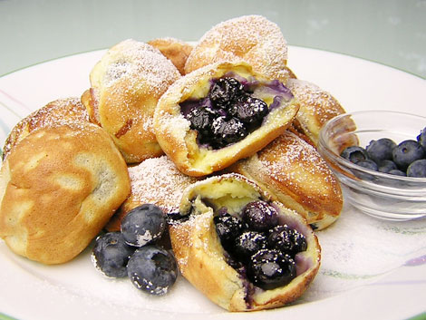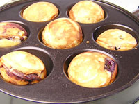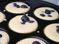 1.薄力粉・アーモンドプードル・ベーキングパウダー・塩はいっしょにふるっておきます。 2.ボールに卵黄を入れて湯せんしながら砂糖の半分を加えよくミキシングします。そこへリコッタチーズと分量の牛乳の3分の1を加えよく合わせます。 3.ふるってある粉類と残りの牛乳を3〜4回に分けて交互に加えながらよく合わせていきましょう。だまがなくなったらそこへ溶かしバターを加えてなじませます。 4.別のボールに卵白をときほぐしメレンゲを作っていきます。残りの砂糖を途中で加えてなめらかなメレンゲにします。このメレンゲを「3」のボールに2〜3回に分けて混ぜていきます。メレンゲが全て入ったら生地の出来上がりです。 5.出来上がった生地は室温で30分ほどおいてから焼きます。中に入れるブルーベリーは洗って水気をきっておきます。デンマークパンを弱火にかけて熱くなったらうっすらオイルを表面になじませて生地を流しいれます。流し入れた生地のところへひとつの丸い型につき4〜5粒のブルーベリーをポロポロと置いていきます。 6.極弱火のまま2分ほど様子を見ましょう。竹串の先でたこ焼きを返す要領で焼き色をチェックします。ちょうど良い焼き色になっていたら上手にひっくり返しましょう。両面きれいな焼き色が付いたら出来上がりです。 MEMO 市販のホットケーキミックスは何かと便利ですが、お家で生地を配合すると今回のようにリコッタチーズを入れてみたり、生地の甘さを調整したり、それぞれのご家庭にあったパンケーキミックスに仕上げることができます。たとえば果実を入れる場合ならこんな生地、メープルシロップや生クリームを添えていただく場合ならこんな生地、甘さをぐっと控えてオリーブやサラミソーセージなどを入れた夕食にも合いそうな生地なら・・・などと、いろいろなタイプのパンケーキ生地をレパートリーのひとつに加えてみてください。 |